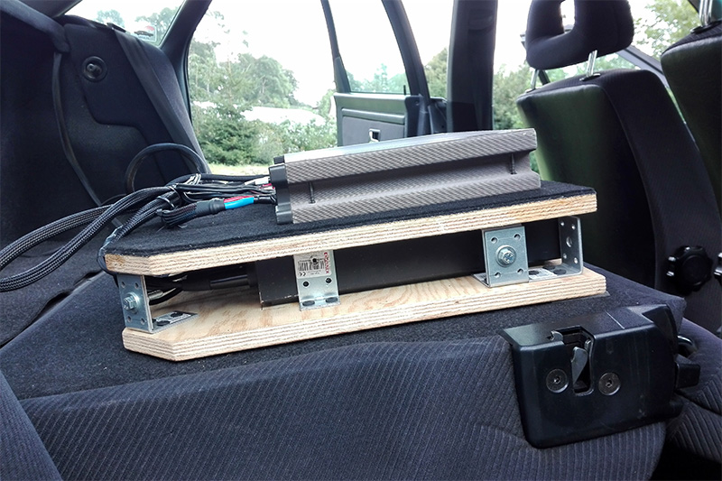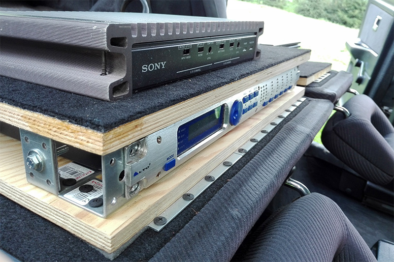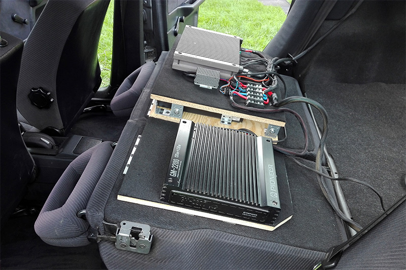 We własnym zakresie opracowałem też podstawy pod wzmacniacze i procesor. Do elementów tych, wykonanych ze sklejki i oklejonych czarnym materiałem obiciowym, zostały przykręcone wszystkie ww. urządzenia i dopiero jako całość zostały one przytwierdzone do oparć tylnych siedzeń. W ten sposób pozbyłem się konieczności dobierania do danego urządzenia odpowiedniej długości wkrętów, a także zapewniłem możliwość łatwego zdemontowania całości w razie zaistnienia takiej potrzeby.
