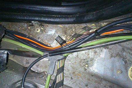 Kabel zasialający prowadzący od akumulatora do bagażnika (bo tam miały przecież znaleźć się najbardziej prądożerne elementy systemu), podobnie kable głośnikowe oraz kabel sygnałowy, poprowadziłem wzdłuż progów, chowając je pod plastikowymi nakładkami na progi. Uznałem przy tym, że zamiast uciskać na siłę wszystkie kable po jednej stronie, lepiej będzie rozdzielić je i dać po obu stronach auta, tak więc kabel zasialący wraz z kablami głośnikowymi do lewego zestawu odseparowanego znalazły się po stronie kierowcy, natomiast kabel sygnałowy razem z kablami do głośników po prawej stronie - po stronie pasażera. Kable starałem się układać wykorzystując, w miarę możliwości, istniejące wiązki, spinając je opaskami zaciskowymi. Zaprezentowane fotki nie są może szczególnie przecudnej urody (jak to podłoga w starym aucie), ale starałem się ująć właśnie sposób montażu kabli. Chodzi o to, aby kable nie "latały" luźno, przez co mogłyby być narażone na uszkodzenia.