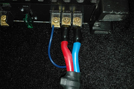 Przy realizacji okablowania pamiętajcie, aby wykonując wszelkie połączenia, szczególnie te wysokoprądowe, zwracać szczególną uwagę na staranność. Kable doprowadzające zasilanie do wzmacniaczy powinny być zakończone konektorami i koszulkami termokurczliwymi (tak, jak na foto poniżej). Bezpiecznik w instalacji car-audio jest zazwyczaj na tyle duży, że może nie zadziałać podczas minimalnego zwarcia pomiędzy pojedynczymi "włoskami" kabli, które gdzieśtam sobie cichaczem "wylazły" i stykają się, iskrząc i grzejąc się, stwarzając tym samym ryzyko pożaru auta! To nie są żarty. Bezpieczeństwo przede wszystkim!