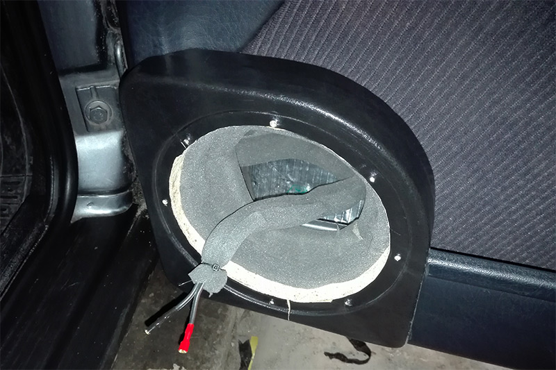 Drzwi przednie w moim aucie nie miały fabrycznie zamontowanych głośników, ani przewidzianego miejsca na nie, więc byłem zmuszony "wyrzeźbić" panele, które wykonałem standardowo z płyty MDF i wykończyłem czarną eko-skórą, o fakturze zbliżonej do boczków drzwi.