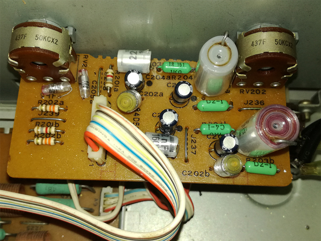 Technicznie, wykonanie powyższych zmian nie było trudne. Przedmiotowy układ znajduje się na osobnej małej płytce, przytwierdzonej bezpośrednio do wyprowadzeń potencjometrów. Poniżej prezentuję fotkę tejże płytki już po wykonaniu modyfikacji. Kondensatory C207a/b nie są widoczne, ponieważ ze względu na ograniczone miejsce, wlutowałem je od spodu.