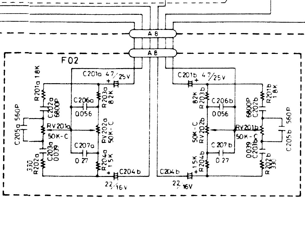Analizując pojedynczy kanał (niech to bedzie kanał A), za kształt charakterystyki częstotliwościowej w zakresie tonów niskich odpowiada potencjometr RV202a, wraz z elementami R203a, R204a, C206a, C207a, natomiast charakter brzmienia w zakresie tonów wysokich kształtuje potencjometr RV201a oraz elementy R201a, R202a i C205a.