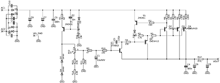 Jak to działa? Napięcie przemienne, trafiające do układu z uzwojenia transformatora, prostowane jest przy pomocy diod D5, D6, D7, D8, a następnie filtrowane przez baterię kondensatorów C9, C7, C5. Elementy T1, R7, C2, D2 i R15, tworzą źródło prądowe, wymuszające przepływ określonego prądu przez diody Zenera D3 i D4. Przy pomocy potencjometru R12, służącego do regulacji napięcia wyjściowego zasilacza, ustalane jest napięcie odniesienia, które po wygładzeniu za pomocą kondensatora C1, trafia na wtórnik emiterowy dużej mocy, zbudowany z T2, Q1, Q2, Q3, Q4. Napięcie wyjściowe trafia na filtr złożony z pojemności C4, C6 i C8. O zabezpieczenie stabilizatora przed przeciążeniem / zwarciem dba tranzystor T3.