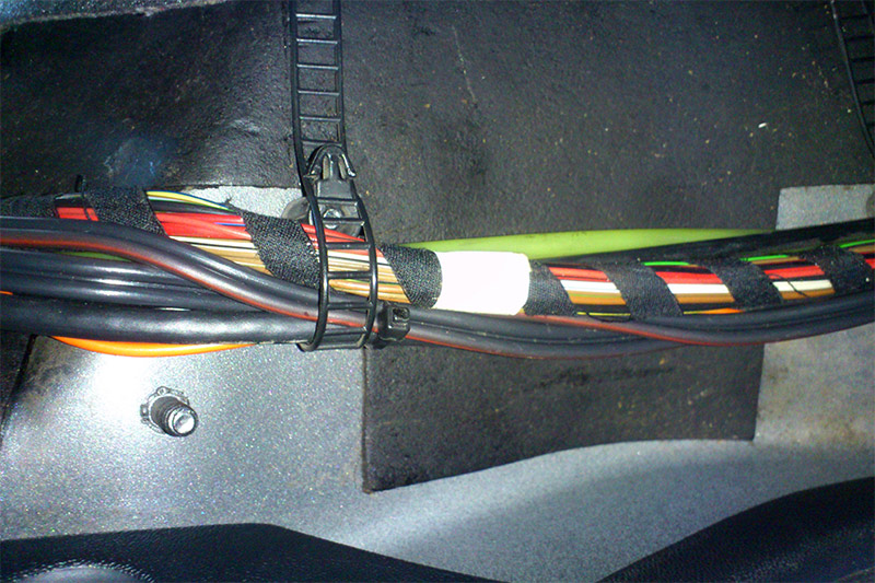 Kabel zasialający prowadzący od akumulatora do bagażnika (bo tam miały przecież znaleźć się najbardziej prądożerne elementy systemu), podobnie kable głośnikowe oraz kabel sygnałowy, poprowadziłem wzdłuż progów, chowając je pod plastikowymi nakładkami na progi. Uznałem przy tym, że zamiast uciskać na siłę wszystkie kable po jednej stronie, lepiej będzie rozdzielić je i dać po obu stronach auta, tak więc kabel zasialący wraz z kablami głośnikowymi do lewego zestawu odseparowanego znalazły się po stronie kierowcy, natomiast kabel sygnałowy razem z kablami do głośników po prawej stronie - po stronie pasażera. Kable starałem się układać wykorzystując, w miarę możliwości, istniejące wiązki, spinając je opaskami zaciskowymi. Zaprezentowane fotki nie są może szczególnie przecudnej urody (jak to podłoga w starym aucie), ale starałem się ująć właśnie sposób montażu kabli. Chodzi o to, aby kable nie "latały" luźno, przez co mogłyby być narażone na uszkodzenia.