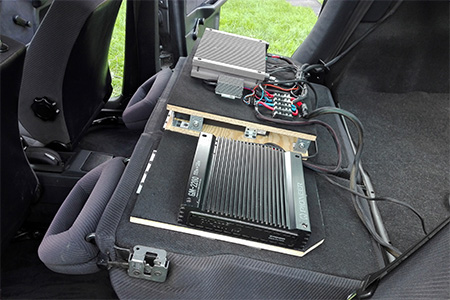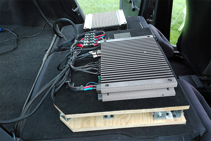 We własnym zakresie opracowałem też podstawy pod wzmacniacze i procesor. Do elementów tych, wykonanych ze sklejki i oklejonych czarnym materiałem obiciowym, zostały przykręcone wszystkie ww. urządzenia i dopiero jako całość zostały one przytwierdzone do oparć tylnych siedzeń. W ten sposób pozbyłem się konieczności dobierania do danego urządzenia odpowiedniej długości wkrętów, a także zapewniłem możliwość łatwego zdemontowania całości w razie zaistnienia takiej potrzeby.