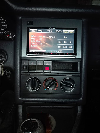 Druga, poważniejsza, rzeźba dotyczyła kokpitu. Radio Pioneer AVH-P4100DVD, które obecnie zostało zainstalowane, jest w tzw. standardzie "2-din". Audi 80 posiada natomiast oryginalnie pojedynczą wnękę na radio, więc, aby zainstalować radio 2-din, musiałem sporo "rzeźbić", usuwając między innymi kratki nawiewu oraz zmieniając odpowiednio kolejność pozostałych elementów kokpitu. Efekt pracy (na foto poniżej) jest oczywiście kwestią gustu, przy czym mi osobiście pasuje i chyba o to chodzi ;)