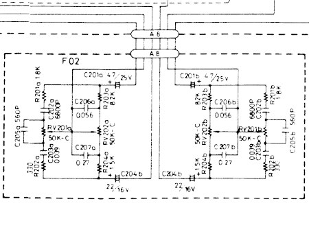 Analizując pojedynczy kanał (niech to bedzie kanał A), za kształt charakterystyki częstotliwościowej w zakresie tonów niskich odpowiada potencjometr RV202a, wraz z elementami R203a, R204a, C206a, C207a, natomiast charakter brzmienia w zakresie tonów wysokich kształtuje potencjometr RV201a oraz elementy R201a, R202a i C205a.