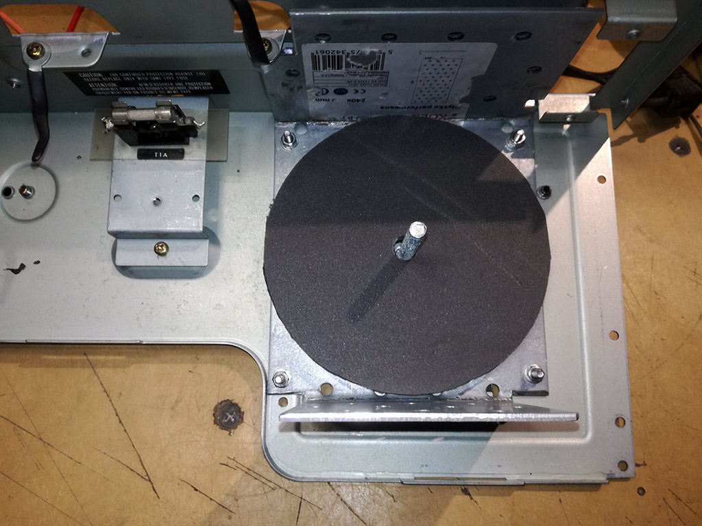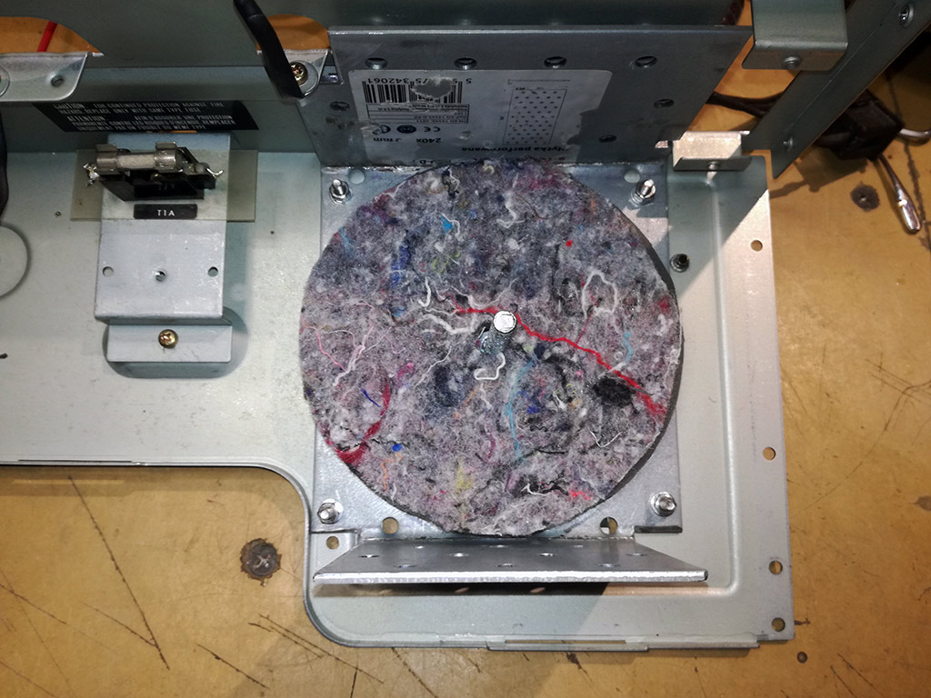 W miejsce oryginalnego transformatora wmontowałem wykonane z blachy stalowej "gniazdo", mające posłużyć jako miejsce dla nowego trafa, przy okazji pełniąc jednocześnie funkcję ekranu oraz usztywnienia obudowy. W celu wyeliminowania ewentualnego niepożądanego efektu drgań, nowy transformator sieciowy umieściłem w "kanapce" złożonej z warstw pianki, filcu oraz gumy.