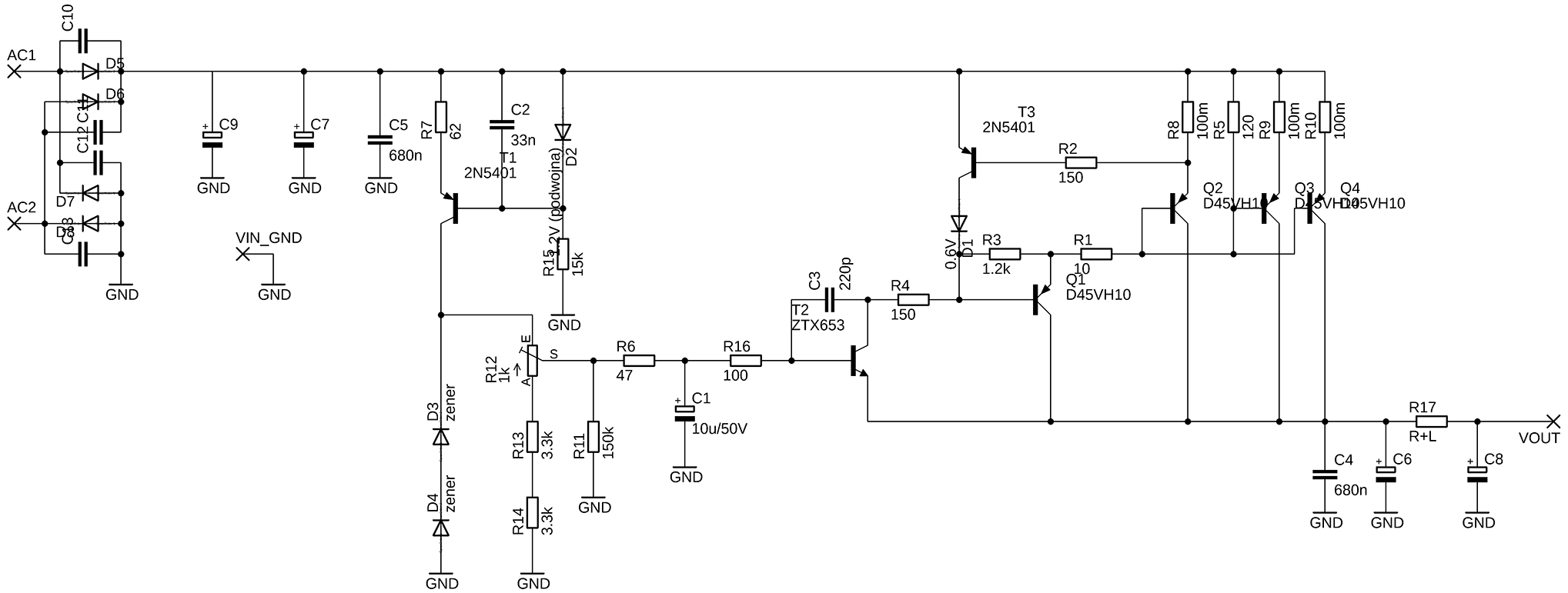Jak to działa? Napięcie przemienne, trafiające do układu z uzwojenia transformatora, prostowane jest przy pomocy diod D5, D6, D7, D8, a następnie filtrowane przez baterię kondensatorów C9, C7, C5. Elementy T1, R7, C2, D2 i R15, tworzą źródło prądowe, wymuszające przepływ określonego prądu przez diody Zenera D3 i D4. Przy pomocy potencjometru R12, służącego do regulacji napięcia wyjściowego zasilacza, ustalane jest napięcie odniesienia, które po wygładzeniu za pomocą kondensatora C1, trafia na wtórnik emiterowy dużej mocy, zbudowany z T2, Q1, Q2, Q3, Q4. Napięcie wyjściowe trafia na filtr złożony z pojemności C4, C6 i C8. O zabezpieczenie stabilizatora przed przeciążeniem / zwarciem dba tranzystor T3.
